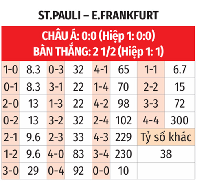 - Hai đội cùng ghi bàn: St.Pauli thành công trong việc ghi bàn ở 7/10 trận gần đây còn với Frankfurt là 9/10 trận vừa qua. Bên cạnh đó, St.Pauli ghi bàn ở 4/6 trận gần nhất trên sân nhà, còn với Frankfurt là ở 8/9 trận sân khách gần đây. Với xu hướng như vậy, khả năng cao hai đội sẽ cùng tìm được đường vào khung thành của nhau.