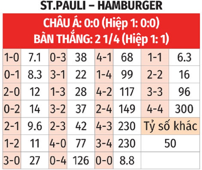 - Ít nhất 1 bàn hiệp 1: 10/12 trận chính thức gần đây của St. Pauli cùng 3/5 trận vừa qua của Hamburg đều có bàn thắng trong 45 phút đầu tiên. 7/10 trận đối đầu gần nhất cũng có bàn thắng trước giờ nghỉ.