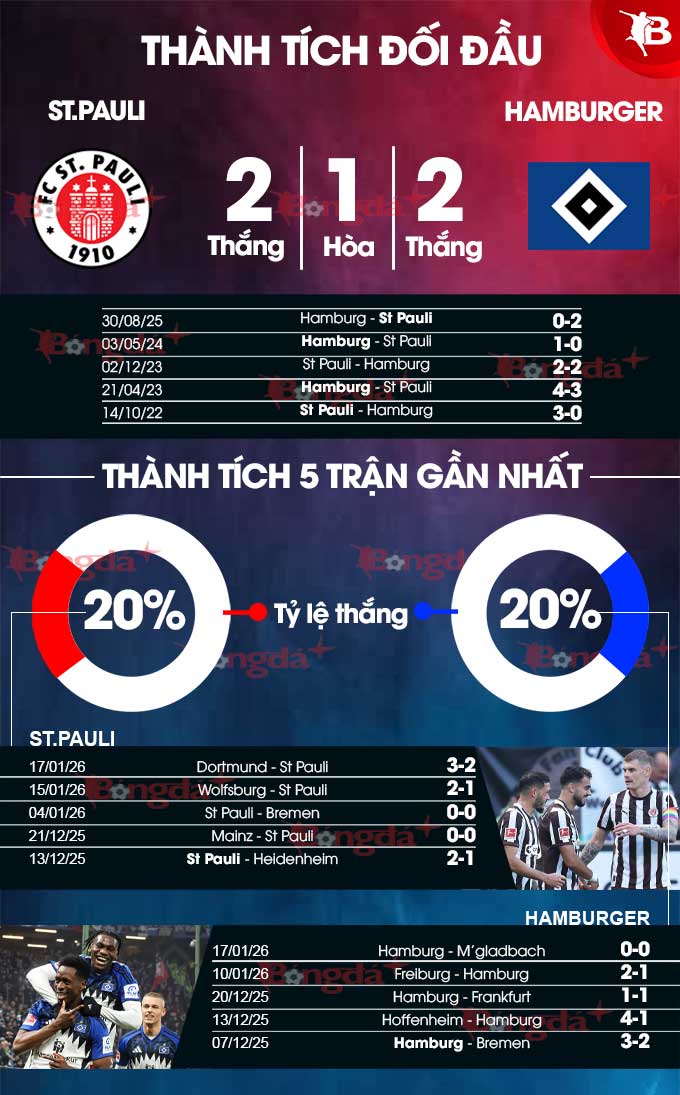 - Từ 3 bàn trở lên: 3/4 trận chính thức gần đây của St. Pauli đều kết thúc với ít nhất 3 bàn thắng được ghi. Lịch sử đối đầu cũng chứng kiến 5/7 trận gặp nhau gần nhất giữa đôi bên có tối thiểu 3 pha làm bàn.