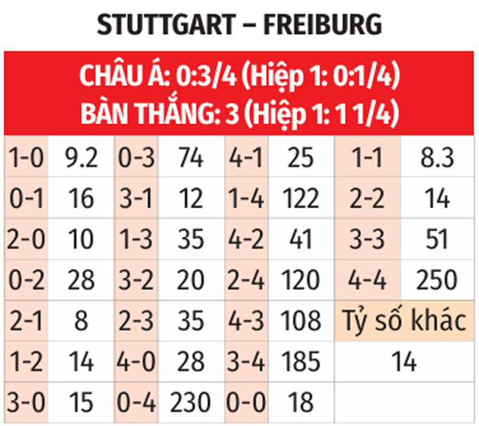 - Lẻ bàn thắng: 8/13 trận đối đầu gần đây giữa 2 CLB có tổng bàn thắng không chia hết cho 2. Ngoài ra, 6/10 trận vừa qua của Stuttgart lẫn Freiburg cũng chứng kiến điều tương tự.