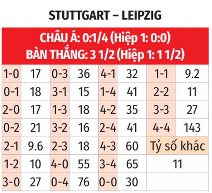 - Hai đội cùng ghi bàn: Stuttgart và Leipzig thành công trong việc ghi bàn ở 9/10 trận gần đây. Bên cạnh đó, Stuttgart ghi bàn ở 8/9 trận gần nhất trên sân nhà, còn với Leipzig là ở 8/10 trận sân khách gần đây. Với xu hướng như vậy, khả năng cao hai đội sẽ cùng tìm được đường vào khung thành của nhau.