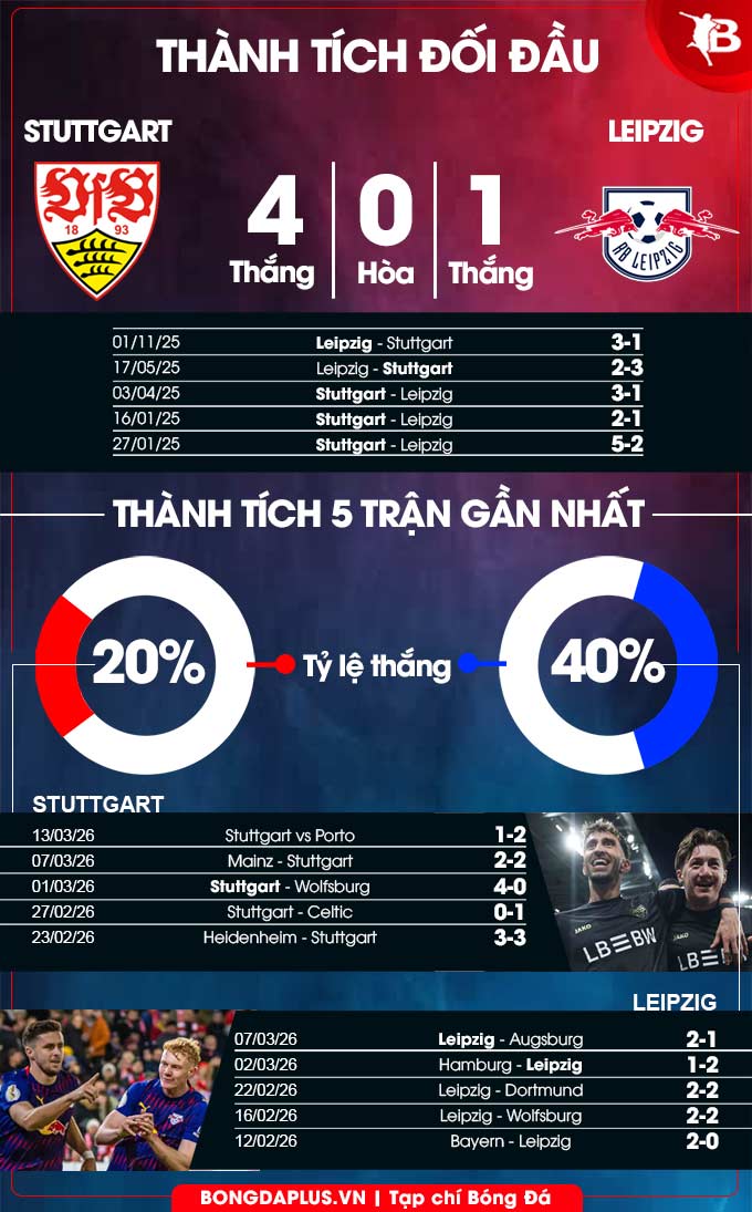 Trên sân nhà, Stuttgart lại thể hiện rất ấn tượng khi thắng 6, hòa 2 và thua 2. Về phần Leipzig, họ thắng 5, hòa 2 và thua 3 ở 10 trận sân khách vừa qua. 9 trận gần nhất đối đầu trực tiếp, Stuttgart và Leipzig mỗi đội thắng 4, còn lại là 1 trận hòa.