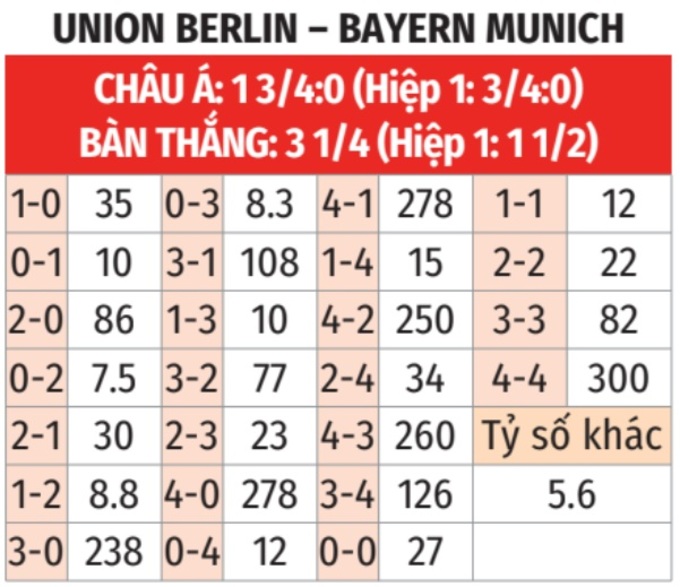 - Tối thiểu 2 bàn hiệp 1: 3/4 lần gặp nhau giữa 2 đội gần đây có từ 2 bàn trở lên trong hiệp 1. 6/9 trận sân nhà gần đây của Union Berlin và 4/5 trận vừa qua của Bayern Munich xảy ra tình trạng tương tự.