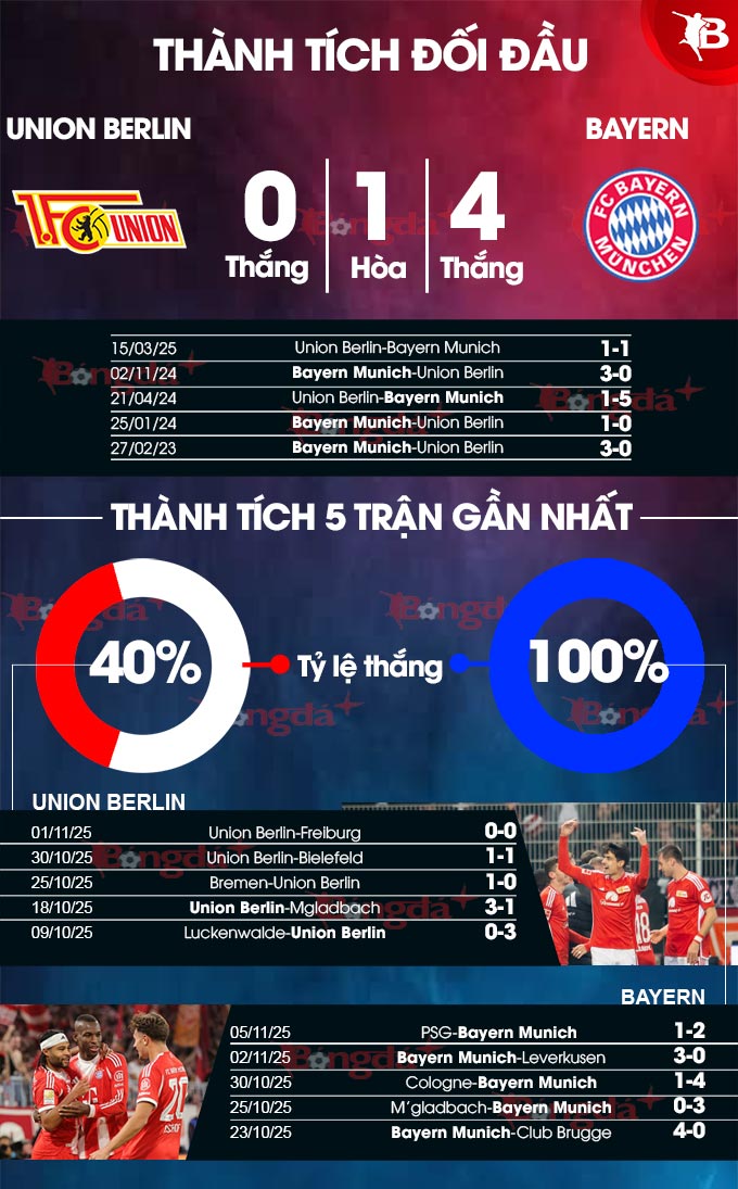 - Hai đội đều ghi bàn: 2 đội xé lưới của nhau trong 5 lần đối đầu gần đây trên sân của Union Berlin. Union Berlin ghi bàn ở 6/8 trận sân nhà gần đây. Còn Bayern Munich ghi bàn liên tiếp 19 trận vừa qua.