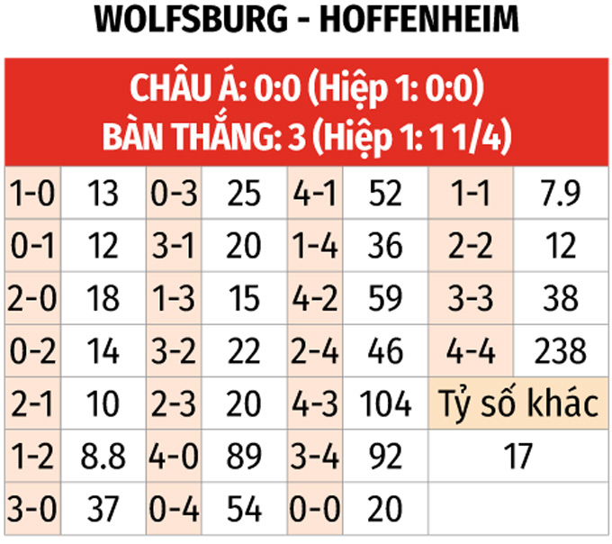 - Ít nhất 1 bàn hiệp 1: 6/7 trận gần đây của Wolfsburg cùng 10/11 trận vừa qua của Hoffenheim đều có ít nhất 1 bàn thắng trong 45 phút đầu tiên. Lịch sử đối đầu cũng chứng kiến 9/10 trận gặp nhau gần nhất giữa đôi bên xuất hiện bàn thắng trước giờ nghỉ, với 5 trận trong số đó có tối thiểu 2 pha làm bàn.