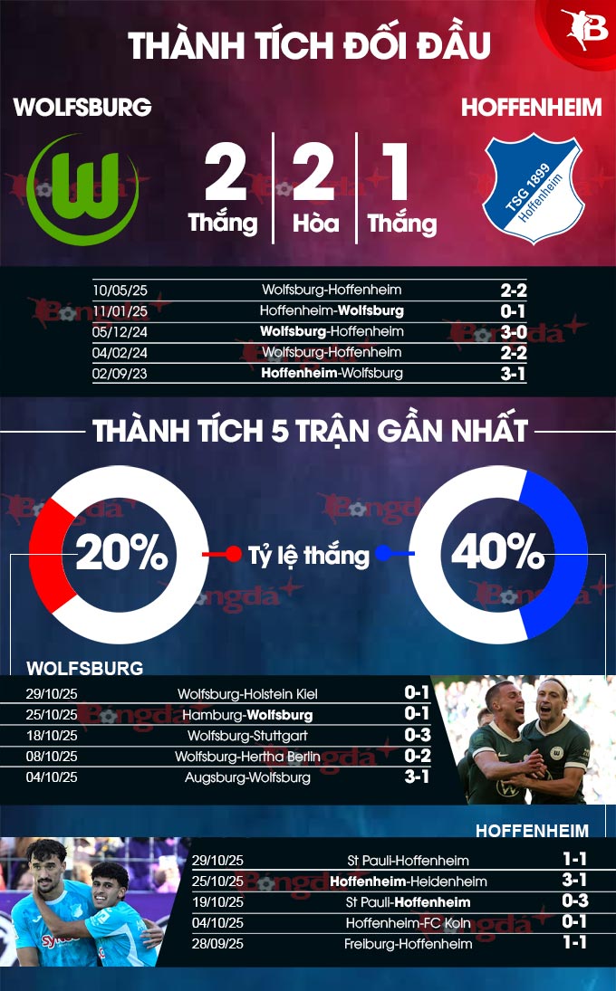 Trái ngược với Wolfsburg, Hoffenheim đang có khởi đầu mạnh mẽ tại Bundesliga khi giành được 13 điểm sau 8 trận mở màn. 6 trong số những điểm đó đến từ hai trận đấu gần đây, khi đoàn quân HLV Christian Ilzer đã đánh bại St Pauli và Heidenheim. Đội khách lúc này đang hướng tới mục tiêu giành chiến thắng trong 3 trận liên tiếp tại Bundesliga, điều mà họ chưa từng làm được kể từ chuỗi 4 trận thắng vào tháng 9/2023.