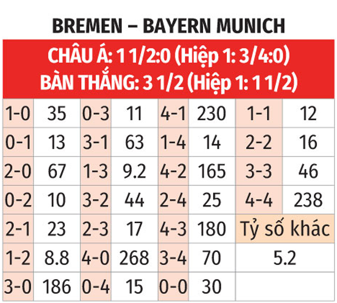 - Chẵn bàn thắng: 6/10 trận gần nhất của Werder Bremen lẫn Bayern Munich có tổng bàn thắng chia hết cho 2. Chưa hết, 5 trận liên tiếp của Bremen trên sân nhà và 6/10 trận vừa xong của Bayern Munich trên sân khách chứng kiến điều tương tự.
