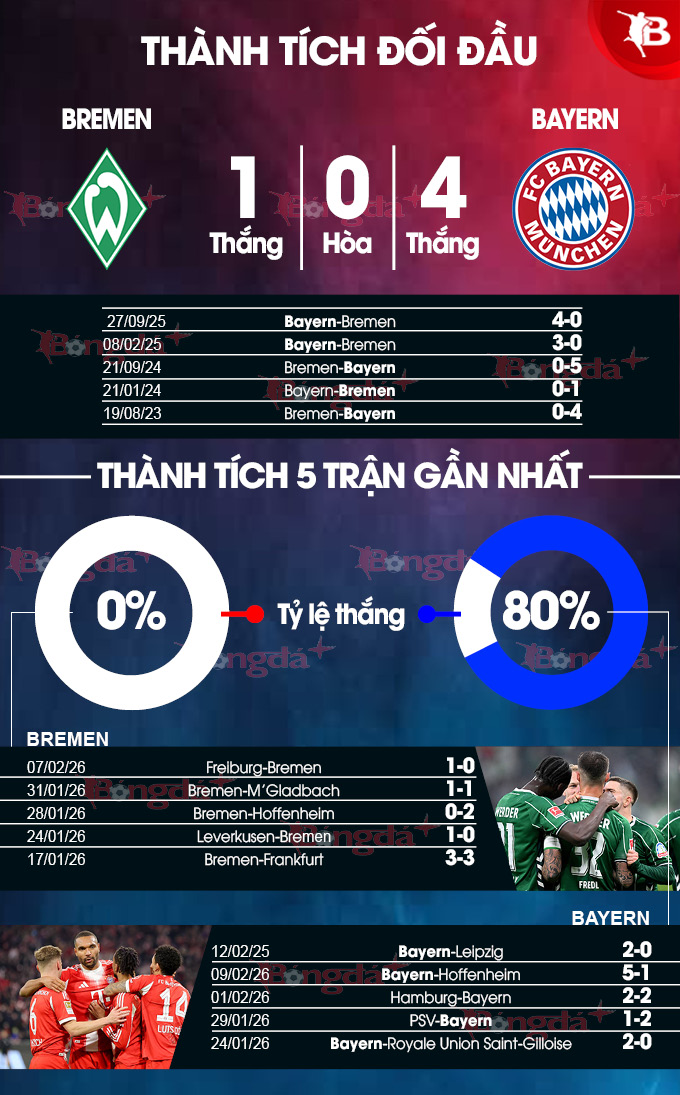 0 - Trong 21 trận gần nhất Bremen tiếp Bayern trên sân nhà, họ chưa từng thắng. Cụ thể, Bremen thua 20 và hòa 1.