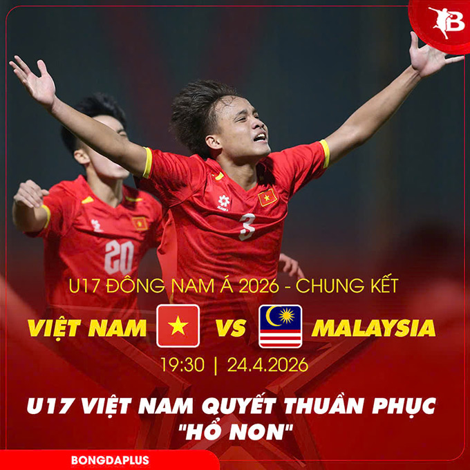 Vào lúc 19h30 tối 24/4, chung kết U17 Việt Nam và U17 Malaysia, tại giải U17 Đông Nam Á 2026 sẽ diễn ra. Trận đấu được trực tiếp trên TV360. Cả hai đội đều có cùng 3 chiến thắng trước chung kết. U17 Việt Nam có một trận hoà. Còn U17 Malaysia chịu 1 thất bại. Trận thua này diễn ra trước chính U17 Việt Nam.