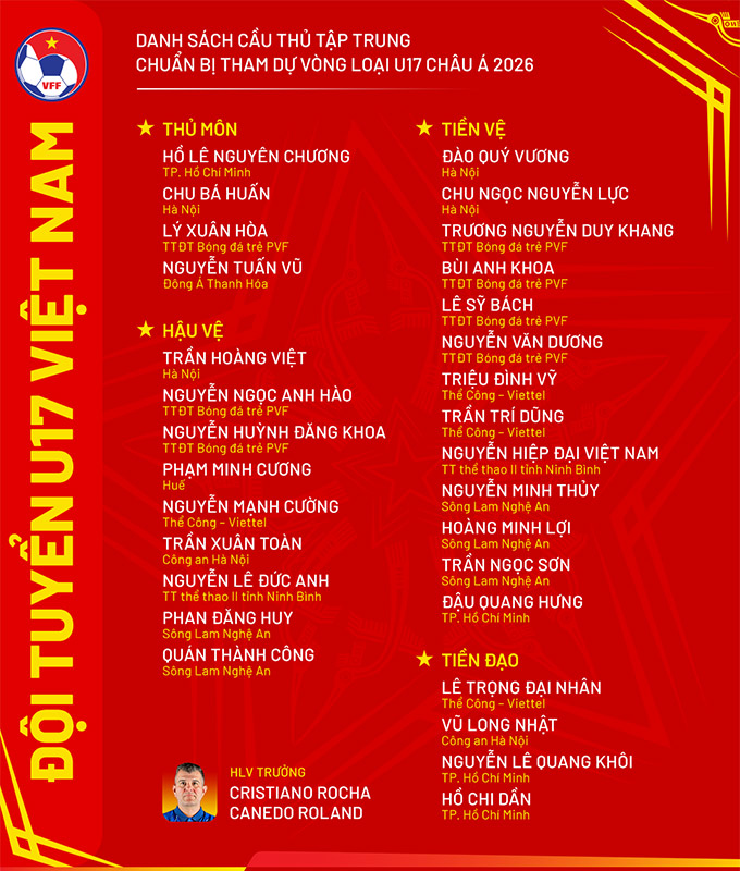 Nằm trong kế hoạch hướng tới Vòng loại U17 châu Á 2026, đội tuyển U17 Việt Nam sẽ hội quân trở lại vào ngày 5/10 tới tại Hà Nội với 30 cầu thủ được triệu tập. Lực lượng chủ chốt được HLV Cristiano lực chọn vẫn là những gương mặt đã góp mặt ở đợt tập trung hồi tháng 5 vừa qua, thi đấu giải quốc tế CFA Team China 2025, trong đó nổi bật có tiền đạo Nguyễn Văn Dương và tiền vệ Chu Ngọc Nguyễn Lực – hai cầu thủ từng dự Vòng chung kết U17 châu Á 2025 tại Saudi Arabia