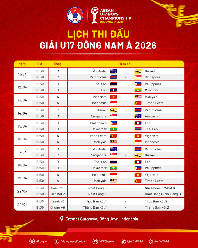Đến buổi chiều cùng ngày, vào lúc 16h, đội sẽ bước vào buổi tập đầu tiên tại Indonesia để hoàn tất khâu chuẩn bị cho trận ra quân gặp U17 Malaysia. Trận đấu sẽ diễn ra vào lúc 15h30 ngày 13/4 trên sân vận động Gelora Joko Samudro. Sau đó, ĐT U17 Việt Nam sẽ gặp Timor Leste vào lúc 15h30 ngày 16/4 và sau đó gặp chủ nhà Indonesia vào lúc 19h10 ngày 19/4.