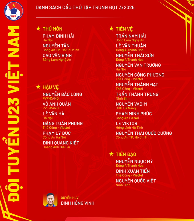Do HLV trưởng Kim Sang Sik đang dẫn dắt Đội tuyển Việt Nam chuẩn bị cho hai trận gặp Nepal tại vòng loại Asian Cup 2027, công tác huấn luyện và điều hành hoạt động tập luyện của đội tuyển U23 Việt Nam tiếp tục được giao cho Quyền HLV trưởng Đinh Hồng Vinh.