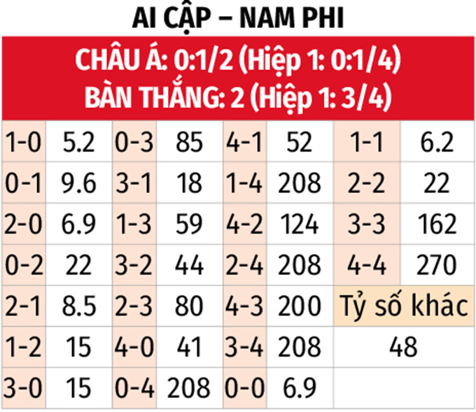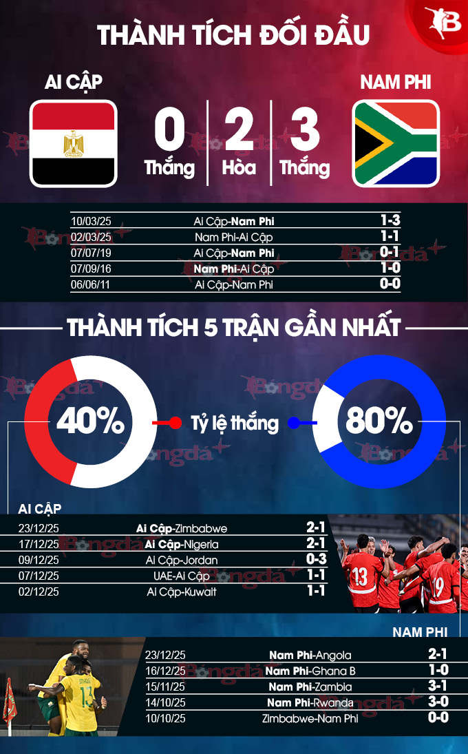 - Nam Phi thắng theo châu Á: Các cầu thủ Ai Cập chỉ thắng theo châu Á 1/12 trận gần đây. Thành tích này hoàn toàn trái ngược Nam Phi, đội toàn thắng châu Á 4 trận vừa qua cùng 5 trận đối đầu gần nhất.