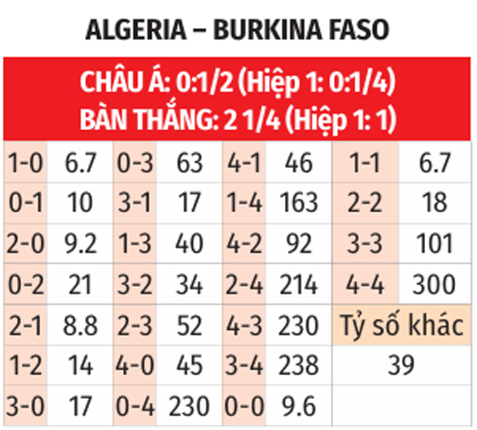 - Chẵn bàn thắng: 3/4 trận so tài vừa qua giữa Algeria vs Burkina Faso có tổng bàn thắng chia hết cho 2. Ngoài ra, 7/10 trận gần nhất của Algeria có kết quả tương tự.