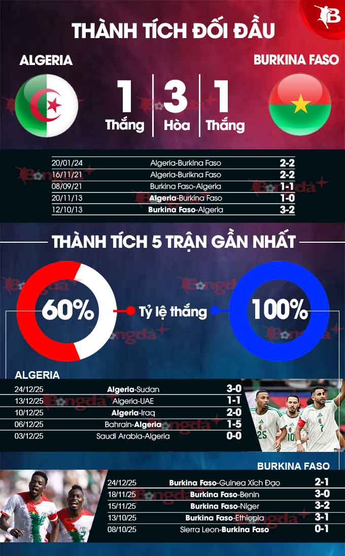 Thậm chí, ngay cả 5 lần gần nhất gặp nhau, Algeria và Burkina Faso cũng rất cân bằng khi mỗi đội thắng 1 trận, còn lại là 3 lần hòa.
