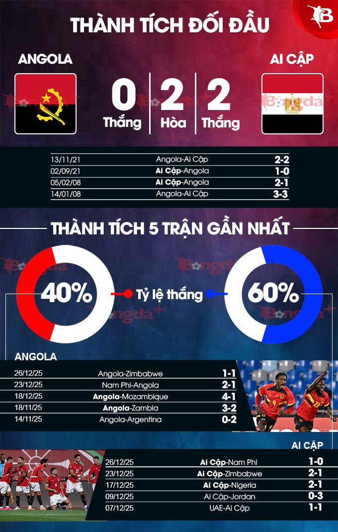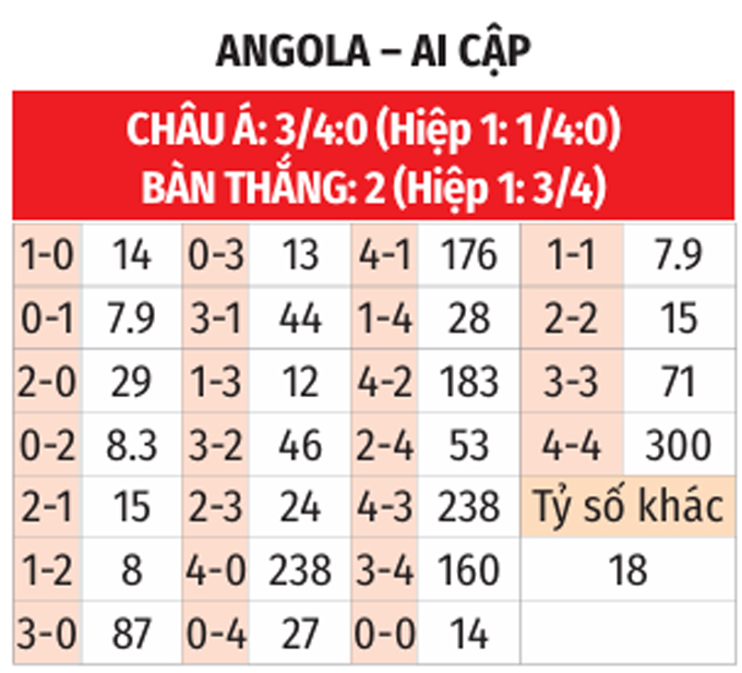 - Lẻ bàn thắng: 3/4 trận gần nhất của Angola có tổng bàn thắng không chia hết cho 2. Ngoài ra, 4 trận liên tiếp vừa qua của Ai Cập có kết quả tương tự.