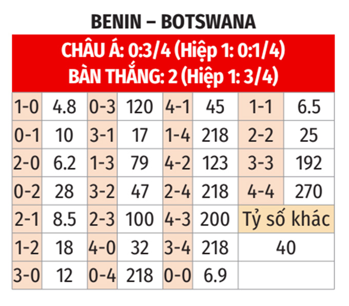 - Lẻ bàn thắng: 6/8 trận gần nhất của Benin và 3/4 trận vừa qua của Botswana đều có tổng bàn thắng là lẻ. Ngoài ra, 3/4 trận gần đây trên sân trung lập của Benin cũng đều khép lại với tổng bàn thắng không chia hết cho 2.