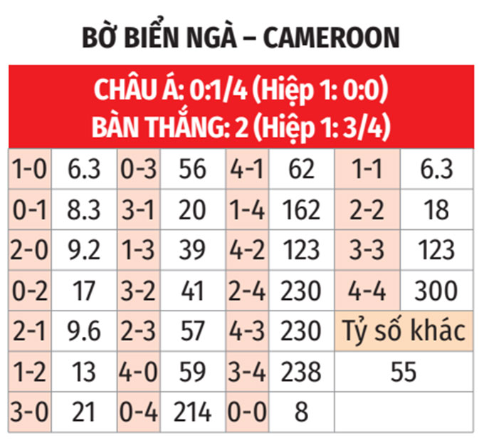 - Tổng bàn thắng lẻ: 4/5 trận gần đây của Bờ Biển Ngà kết thúc với tỷ số lẻ. 4/6 trận gần nhất của Cameroon cũng có số bàn thắng không chia hết cho 2.
