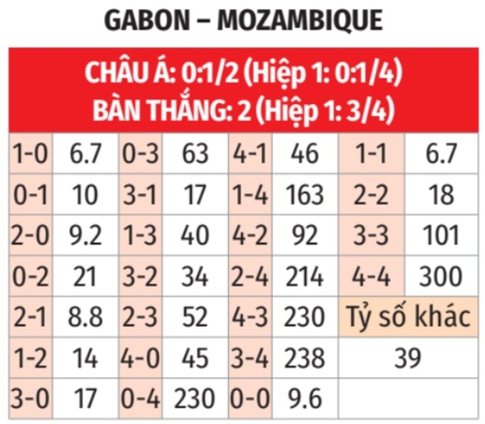 - Lưới rung hiệp 1: 7/10 trận đấu gần đây của Gabon tính trên mọi đấu trường đều có bàn thắng được ghi ở hiệp đầu. Tình trạng tương tự xảy ra ở 6/7 trận vừa qua của Mozambique.