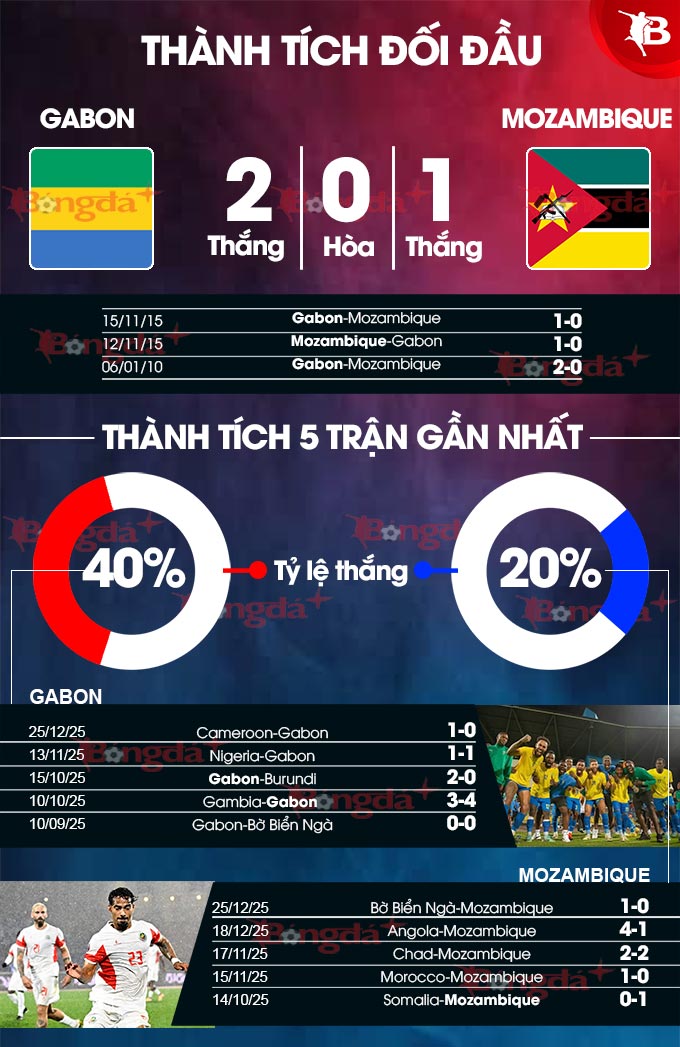 - Tối đa 2 bàn cả trận: 3 lần chạm trán giữa 2 đội gần đây đều kết thúc với tối đa 3 bàn thắng. 4/5 trận chính thức vừa qua của Gabon và 3/4 trận chính thức mới nhất của Mozambique xảy ra tình trạng tương tự.