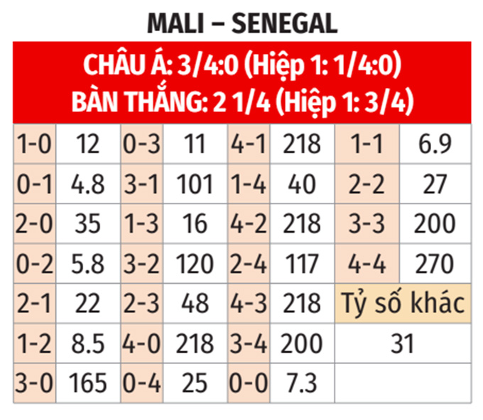 - Senegal thắng theo châu Á: Senegal thắng 4/6 cuộc đối đầu gần nhất, thắng 7/9 trận gần đây, thắng 3 và hòa 1, thua 1 ở 5 trận vừa qua trên sân trung lập. Trong khi đó, Mali thua 3, hòa 1 và chỉ thắng 1 ở 5 trận gần đây; thua 3, hòa 1 ở 4 trận gần nhất trên sân trung lập. Do đó, giới mộ điệu có thể đặt niềm tin vào Senegal ở trận này.