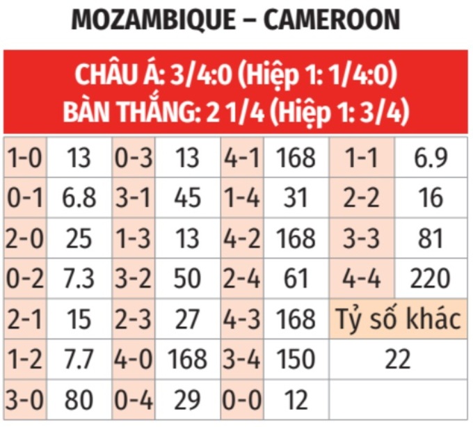 - Lẻ bàn thắng: 6/7 trận đấu gần đây của Mozambique kết thúc với tổng số bàn thắng là số lẻ. 8/13 trận chính thức vừa qua của Cameroon xảy ra tình trạng tương tự.