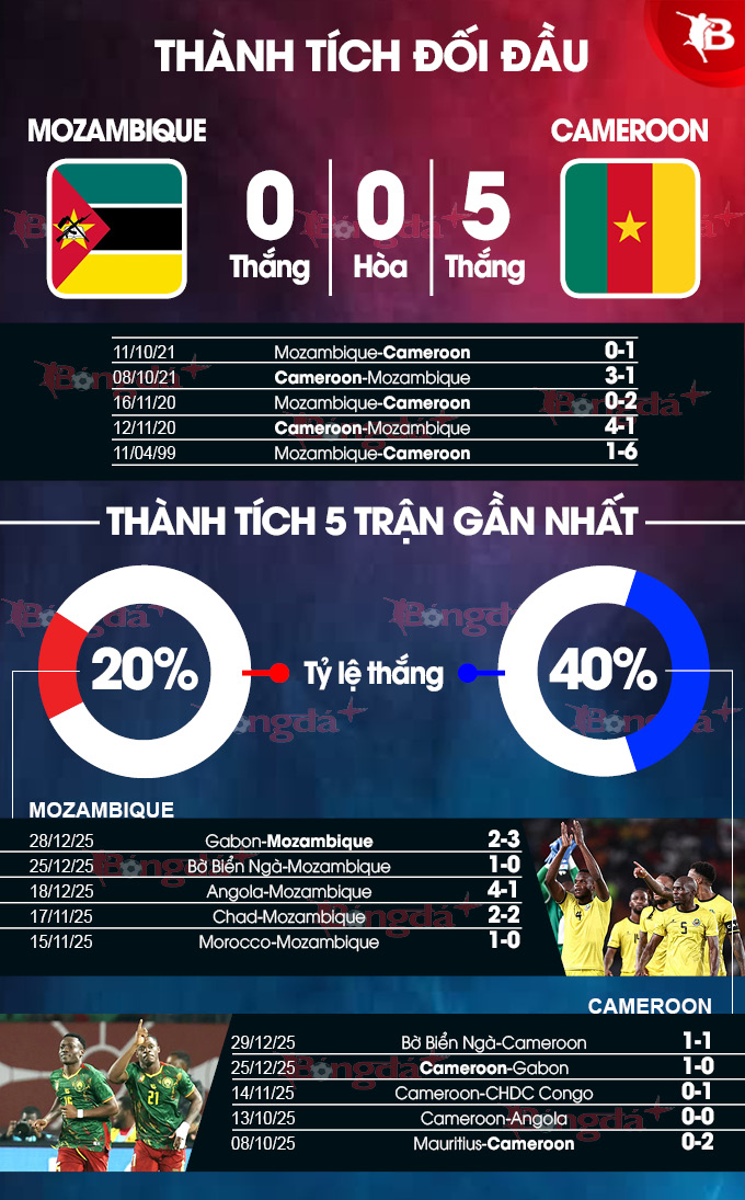 Quan trọng là Cameroon luôn át vía Mozambique trong những lần đối đầu trong quá khứ. Theo thống kê, trong cả 4 cuộc đụng độ gần nhất, “Sư tử bất khuất” đều giành chiến thắng. Trong 4 trận đấu ấy, họ ghi 10 bàn thắng vào lưới của Mozambique, trong khi chỉ phải vào lưới nhặt bóng 2 lần.