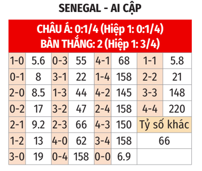 - Tổng bàn thắng từ 2 đến 3: 4/6 trận gần nhất của Senegal và 8/11 trận gần đây của Ai Cập đều có 2 hoặc 3 bàn thắng cả trận. Hơn nữa, 9/11 trận vừa qua trên sân trung lập của Ai Cập cũng chứng kiến 2 hoặc 3 bàn thắng cả trận. Xem ra, trận này khó có ngoại lệ.