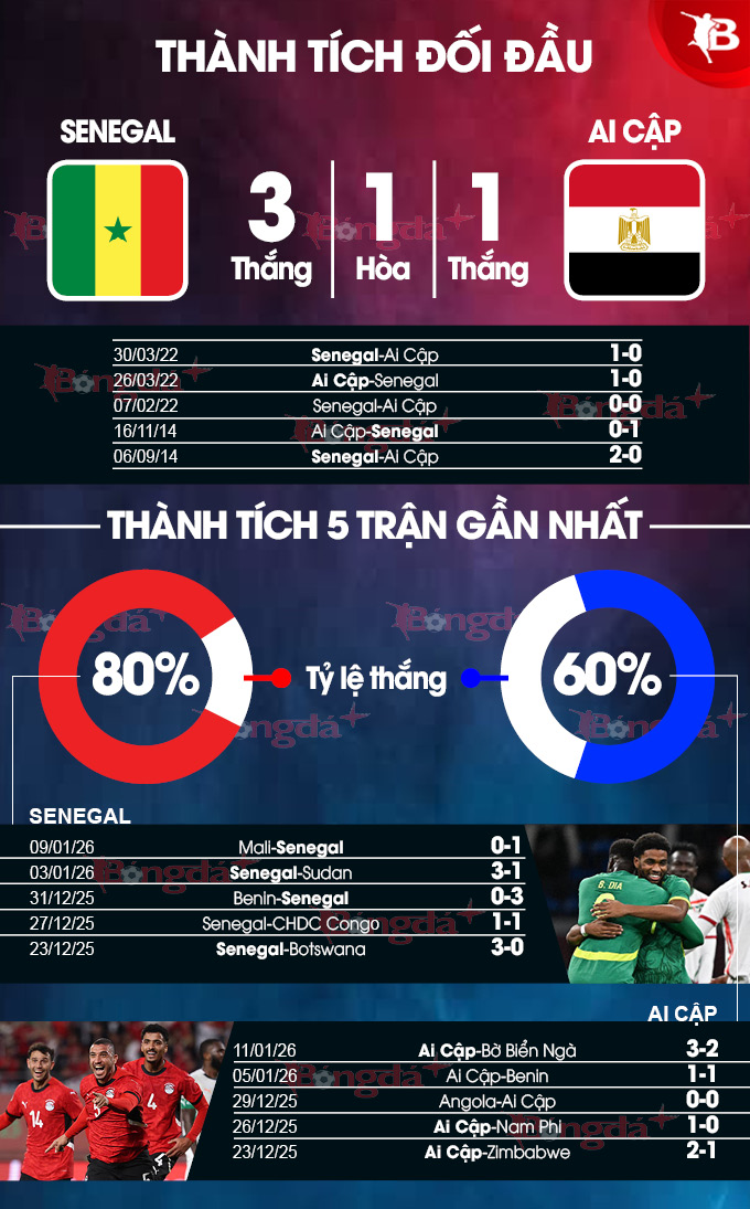 - Hiệp 1 có ít nhất 1 bàn thắng: 6/7 trận đối đầu gần nhất, 12/13 trận gần đây của Senegal và 5/7 trận vừa qua của Ai Cập đều có ít nhất 1 bàn thắng trong hiệp 1. Hơn nữa, 7/8 trận gần đây của Senegal trên sân trung lập và 8/10 trận vừa qua trên sân trung lập của Ai Cập đều có tối thiểu 1 lần lưới rung trong hiệp đấu đầu tiên.