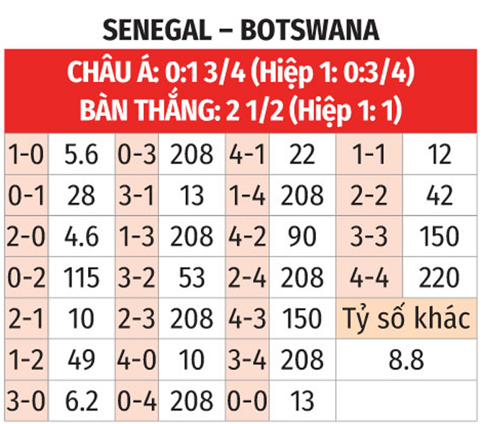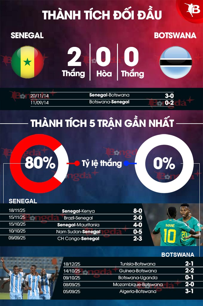 So về đối đầu, Botswana mới gặp Senegal 2 lần nhưng đều thua. Ngoài ra, Senegal có kinh nghiệm, đội hình thiện chiến và là một trong những ứng viên vô địch. Nhiều khả năng, Senegal sẽ có 3 điểm ở lượt thi đấu thứ nhất này.