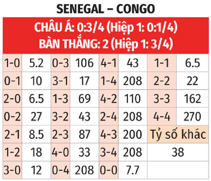 - Tối thiểu 3 bàn: 5/6 trận gần đây của Senegal đều kết thúc với ít nhất 3 bàn thắng được ghi. Lịch sử đối đầu cũng chứng kiến 4/6 trận gặp nhau gần nhất giữa đôi bên có tối thiểu 3 pha làm bàn.
