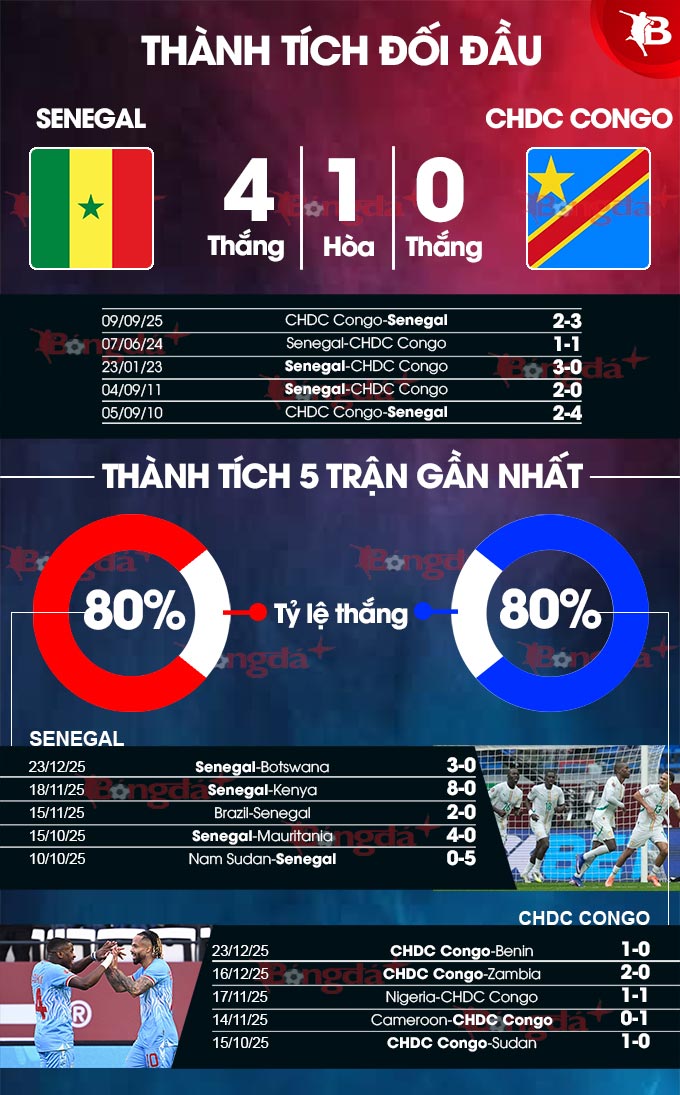 Chiến dịch AFCON 2025 của CHDC Congo bắt đầu bằng chiến thắng sít sao nhưng quý giá 1-0 trước Benin. Phong độ thi đấu gần đây cho thấy CHDC Congo đến Morocco với tâm trạng tự tin, khi đã giành được 5 chiến thắng và 1 trận hòa trong 6 trận đấu chính thức gần nhất, ghi được 7 bàn thắng và chỉ để thủng lưới 1 bàn. Tuy nhiên, lịch sử lại đang chống lại thầy trò HLV Sebastien Desabre, khi họ để thua 6, hòa 2 và chỉ thắng 1 trong 9 lần gặp Senegal.