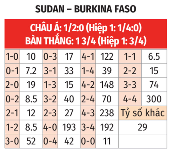 - Tối thiểu 4 thẻ vàng: Cà 5 trận gần đây của Burkina Faso đều có tối thiểu 4 thẻ vàng. 7 trận gần nhất của Sudan số thẻ vàng cũng không dưới 4.