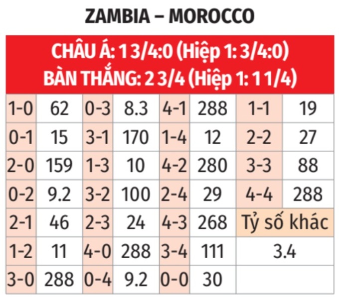 - Chẵn bàn thắng: 4/5 trận đấu gần đây của Zambia và 3 trận gần nhất của Morocco đều kết thúc với tổng số bàn thắng là số chẵn. Tình trạng tương tự xảy ra ở 2 lần chạm trán giữa 2 đội gần đây.