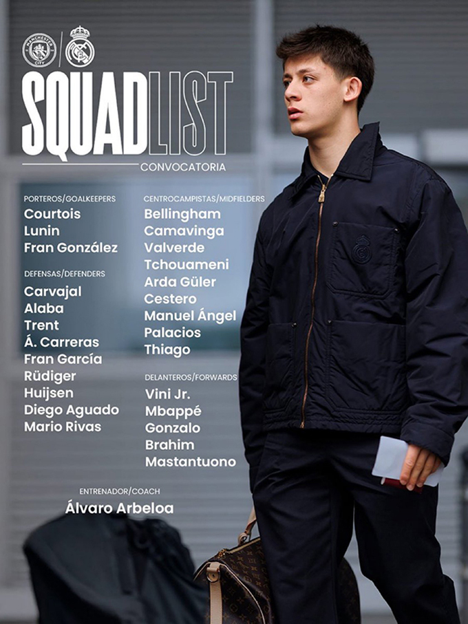 Real Madrid vừa đón nhận loạt tin vui về nhân sự trước chuyến làm khách tới sân Etihad của Man City ở lượt về vòng 1/8 Champions League 2025/26. Đáng chú ý nhất trong danh sách hành quân lần này là sự hiện diện của bộ ba cầu thủ gồm tiền đạo Kylian Mbappe, tiền vệ Jude Bellingham và hậu vệ Alvaro Carreras.