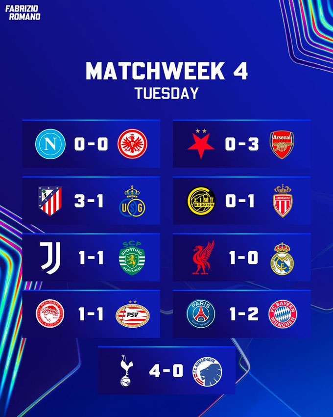 Đầu tiên là Bayern Munich, đội đã đánh bại ĐKVĐ PSG ngay trên sân đối thủ với tỷ số 2-1. Tiếp đến là Arsenal với chiến thắng 3-0 trước Slavia Prague. Và mới nhất là Inter Milan sau khi họ vượt qua Kairat với tỷ số 2-1 ở loạt trận rạng sáng nay.