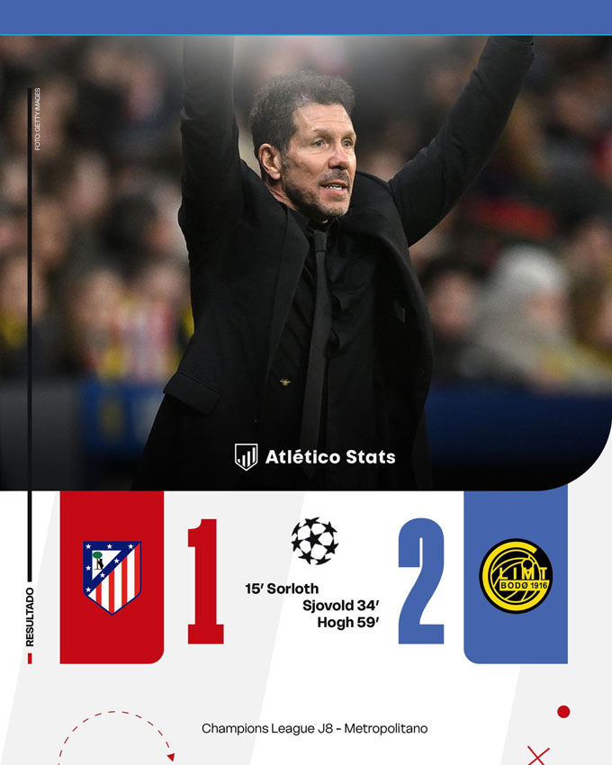 Đội bóng cùng thành phố với Real là Atletico cũng đã phải nhận thất bại muối mặt 1-2 ngay trên sân nhà trước Bodo/Glimt. Sorloth mở tỷ số cho đội chủ nhà ở phút 15 nhưng Sjovold đã ghi bàn gỡ hòa cho đội khách sau đó gần 20 phút.