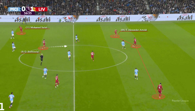 Từ đó, Alexander-Arnold có thể chuyển hướng bóng sang cánh đối diện hoặc tung ra đường chuyền cho một cầu thủ băng xuống bên phải, như anh từng làm trong trận gặp đối thủ sắp tới của Liverpool, Man City, hồi tháng 2. Mohamed Salah giữ biên, trong khi pha di chuyển của Dominik Szoboszlai khiến hàng pressing đối phương rối loạn.