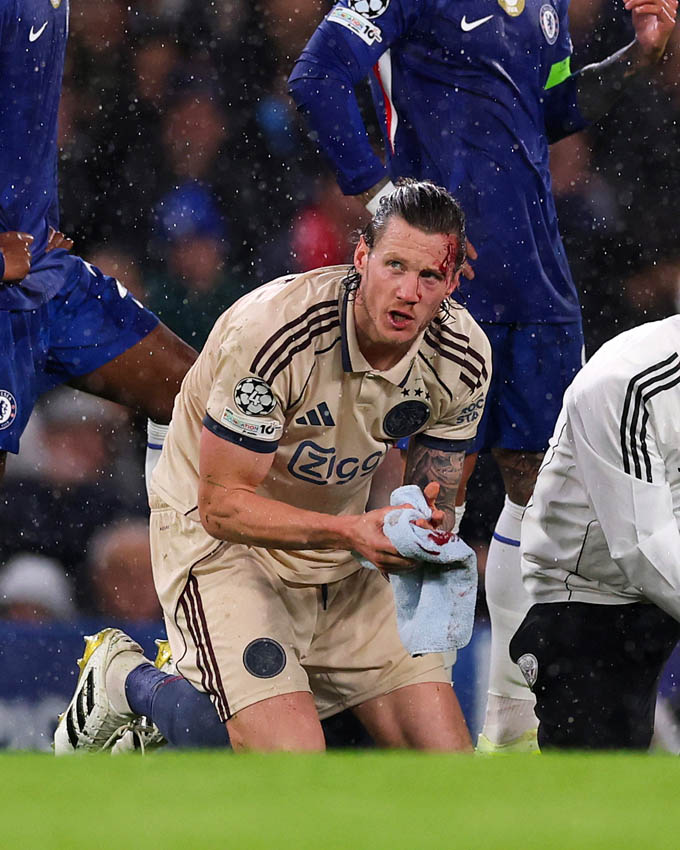 Ngay lập tức, cầu thủ người Hà Lan ngã xuống sân với vết rách lớn trên đầu, máu chảy khiến trọng tài phải tạm dừng trận đấu để đội ngũ y tế vào sân.