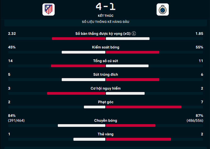 Thắng 4-1 ở lượt về và vượt qua Club Brugge với tổng tỷ số 7-4 sau 2 lượt đấu, Atletico vào vòng 1/8. Theo lịch, Atletico sẽ gặp một trong hai đại diện nước Anh: Liverpool hoặc Tottenham.