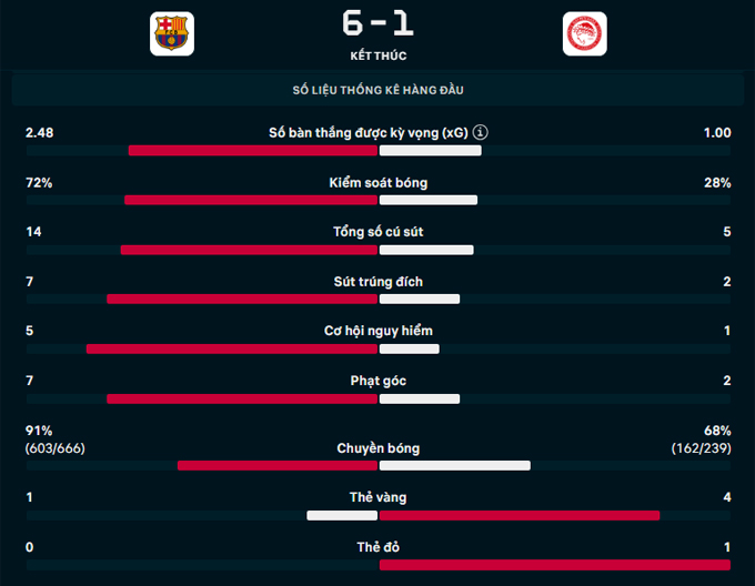 Ở các phút 74 và 79, Rashford hoàn tất ngày thi đấu như mơ với 2 pha lập công. Xen giữa những khoảnh khắc tỏa sáng của tiền đạo người Anh, Fermin Lopez cũng kịp hoàn tất cú hat-trick vào phút 76. Chung cuộc, Barcelona giành chiến thắng tưng bừng 6-1 trước Olympiakos.