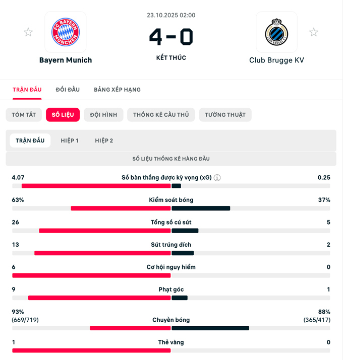 Trận đấu giữa Bayern vs Club Brugge tại lượt trận thứ 3 vòng phân hạng Champions League 2025/26 đã kết thúc với tỷ số 4-0 nghiêng về phía đội chủ nhà. Hùm xám đã toàn thắng cả 12 trận trên mọi đấu trường từ đầu mùa, một kỷ lục mới của bóng đá Đức.