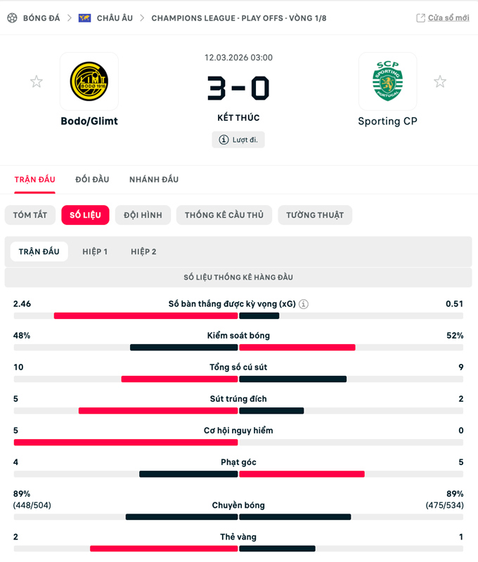 Kết quả cuối cùng của trận đấu là 3-0 nghiêng về phía Bodo/Glimt và hai đội sẽ tái đấu tại Lisbon vào thứ Tư tới. Sức chứa của sân Jose Alvalade thậm chí có thể đủ chỗ cho gần như toàn bộ cư dân của thị trấn đánh cá nhỏ bé, quê hương của Bodo/Glimt. Tại đó, Bodo/Glimt sẽ hướng tới việc viết tiếp một chương lịch sử khác trong câu chuyện cổ tích của mình bằng cách giành vé vào tứ kết, nơi họ có thể chạm trán Arsenal hoặc Bayer Leverkusen.