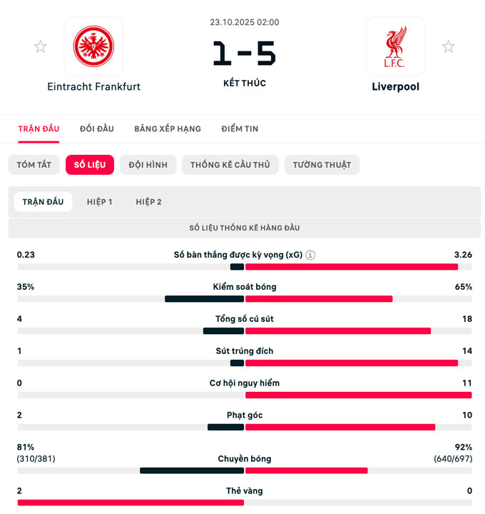 Đội hình thi đấu Frankfurt vs Liverpool