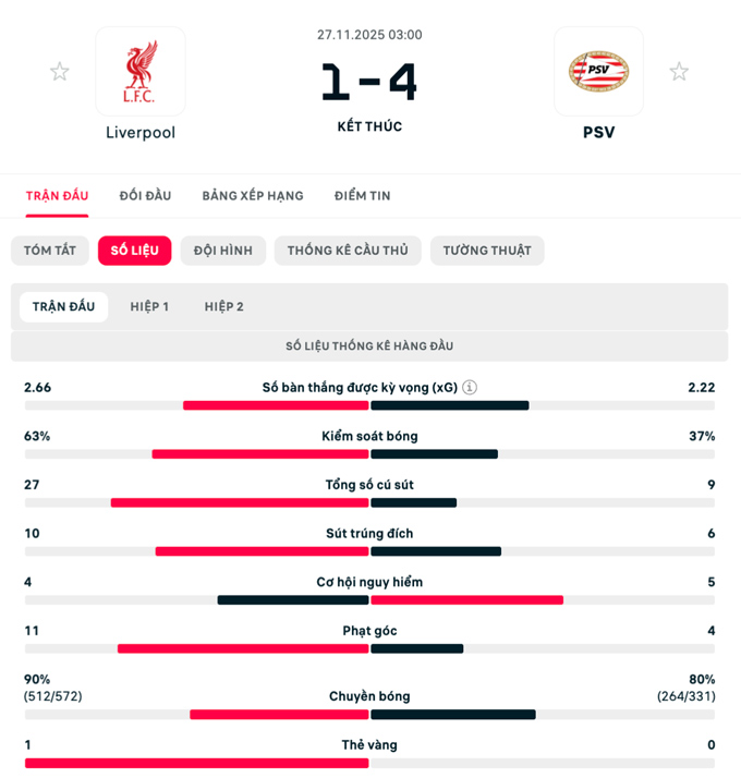 Chung cuộc, Liverpool thua 1-4 ngay trên sân nhà trước PSV và tiếp tục chìm sâu vào đáy khủng hoảng.