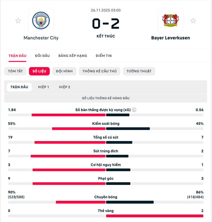 Trận đấu giữa Man City vs Leverkusen tại lượt đấu thứ 5 vòng phân hạng Champions League 2025/26 đã kết thúc với tỷ số 2-0 nghiêng về phía đội khách. Đây đã là thất bại thứ 2 liên tiếp trên mọi đấu trường của Man xanh.