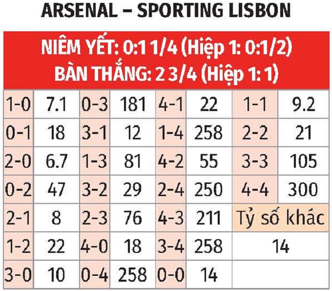 - Tối đa 1 bàn hiệp 1: 8/9 trận gần đây của Arsenal cùng 4/6 trận đối đầu gần nhất đều có tối đa 1 bàn thắng trong hiệp đầu tiên. Với Sporting Lisbon, 2 trận vừa qua thậm chí kết thúc hiệp một với tỷ số hòa 0-0.