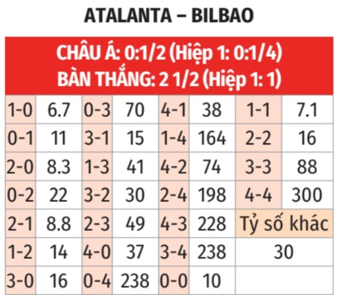 - Tối thiểu 1 bàn hiệp 1: 8/9 trận đấu gần đây của Atalanta xuất hiện từ 1 bàn thắng trở lên trong hiệp 1. Tình trạng tương tự xảy ra ở 5 trận gần nhất của Bilbao.