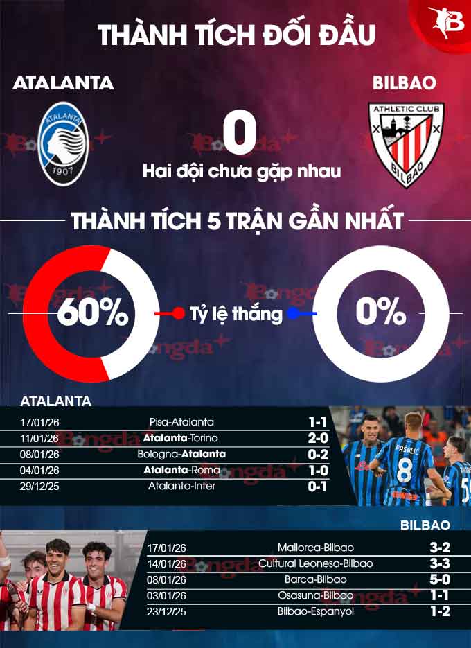 Atalanta gần đây thi đấu khá ấn tượng. Trong 12 trận đấu chính thức trở lại đây, họ giành 9 chiến thắng, hòa 1, chỉ phải nhận 2 thất bại. Với phong độ ấy, đại diện của Serie A có lý do để tự tin bước vào trận đấu với Bilbao sắp tới với mục tiêu giành 3 điểm.