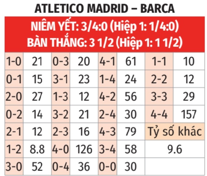 - Tối thiểu 2 bàn hiệp 1: 4/5 lần gặp giữa 2 đội gần đây đều có từ 2 bàn thắng trở lên trong hiệp 1. Tình trạng tương tự xảy ra ở 6/7 trận sân nhà gần đây của Atletico và 4/6 trận vừa qua của Barca.